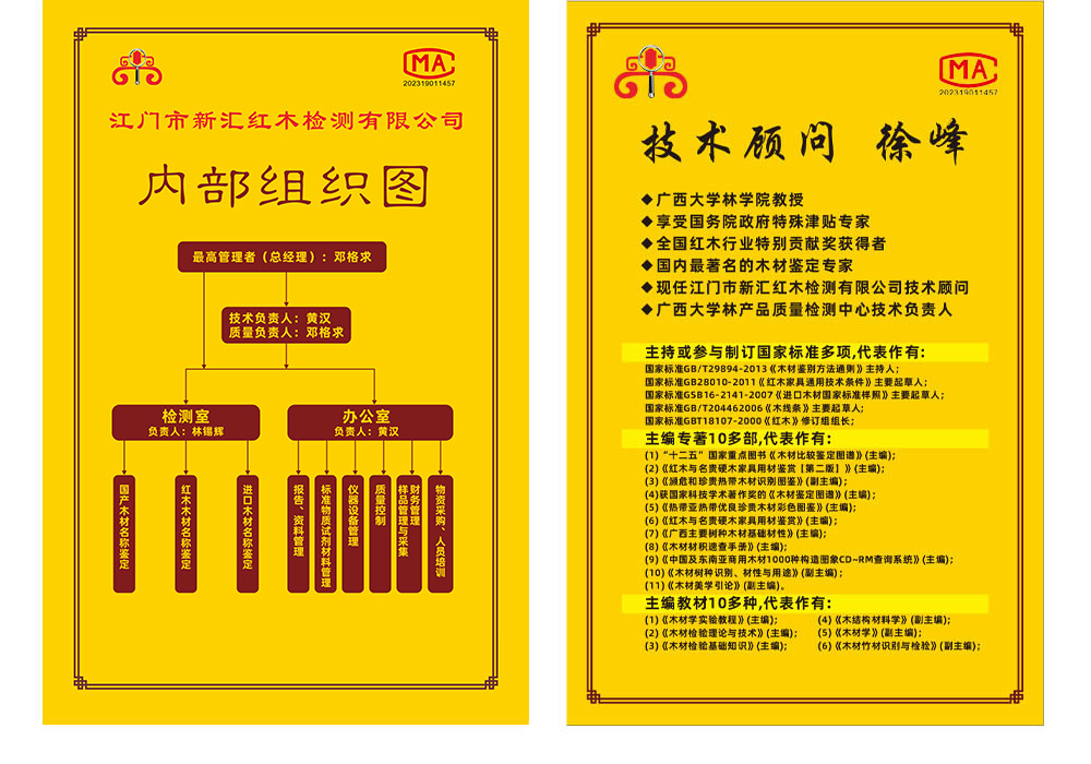 江门市新汇红木检测有限公司位于中国古典家具三大流派“广作”的发源地广东新会的红木专业市场新会古典家具城。在中国古典家具之都博览中心的三楼拥有日常检测及办公场地约625平方米,由国内红木材质鉴别三大权威专家之一、享受国务院特殊津贴的广西大学林学院徐峰教授任总顾问。公司技术力量雄厚、检测仪器先进齐全,可开展木块取样及家具无损检测。拥有多名木材研究博士、硕士、中级工程师、助理工程师等科研人员和多名专家顾问团队,每年在专业杂志刊物发表论文多篇;拥有国内外红木及名贵硬木木材标本200多种,永久显微切片300多种;每年开展红木检测业务4,000单以上。同时公司还拥有进口高新技术设备工业CT射线透视仪、3D立体彩色扫描仪等先进设备,对家具质量进行专业检测并提供产品质量的参考意见。